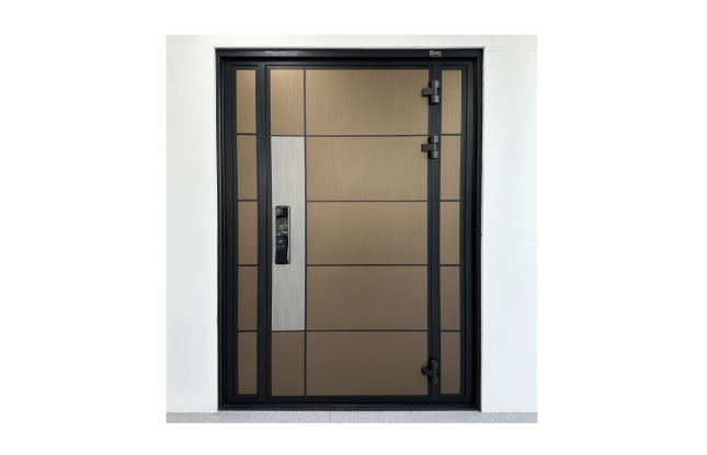 공장에 전시된 모델인 SH3021(블랙+미디엄브론즈브러쉬) 최고급 프리미엄 더블단열도어 입니다. ..